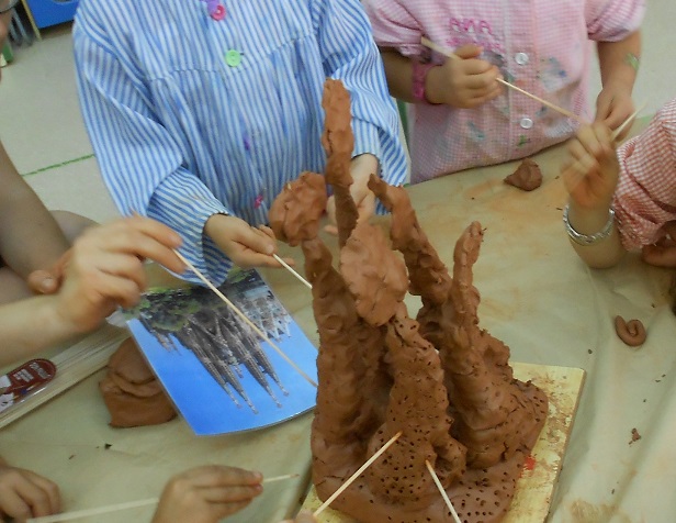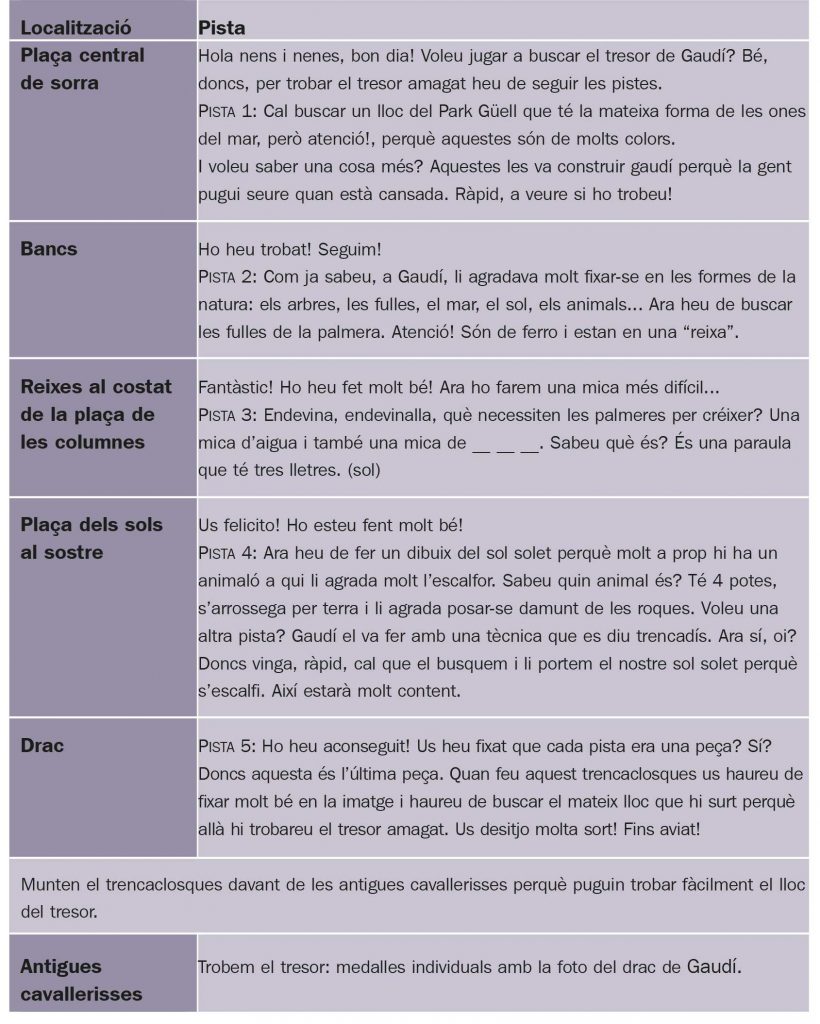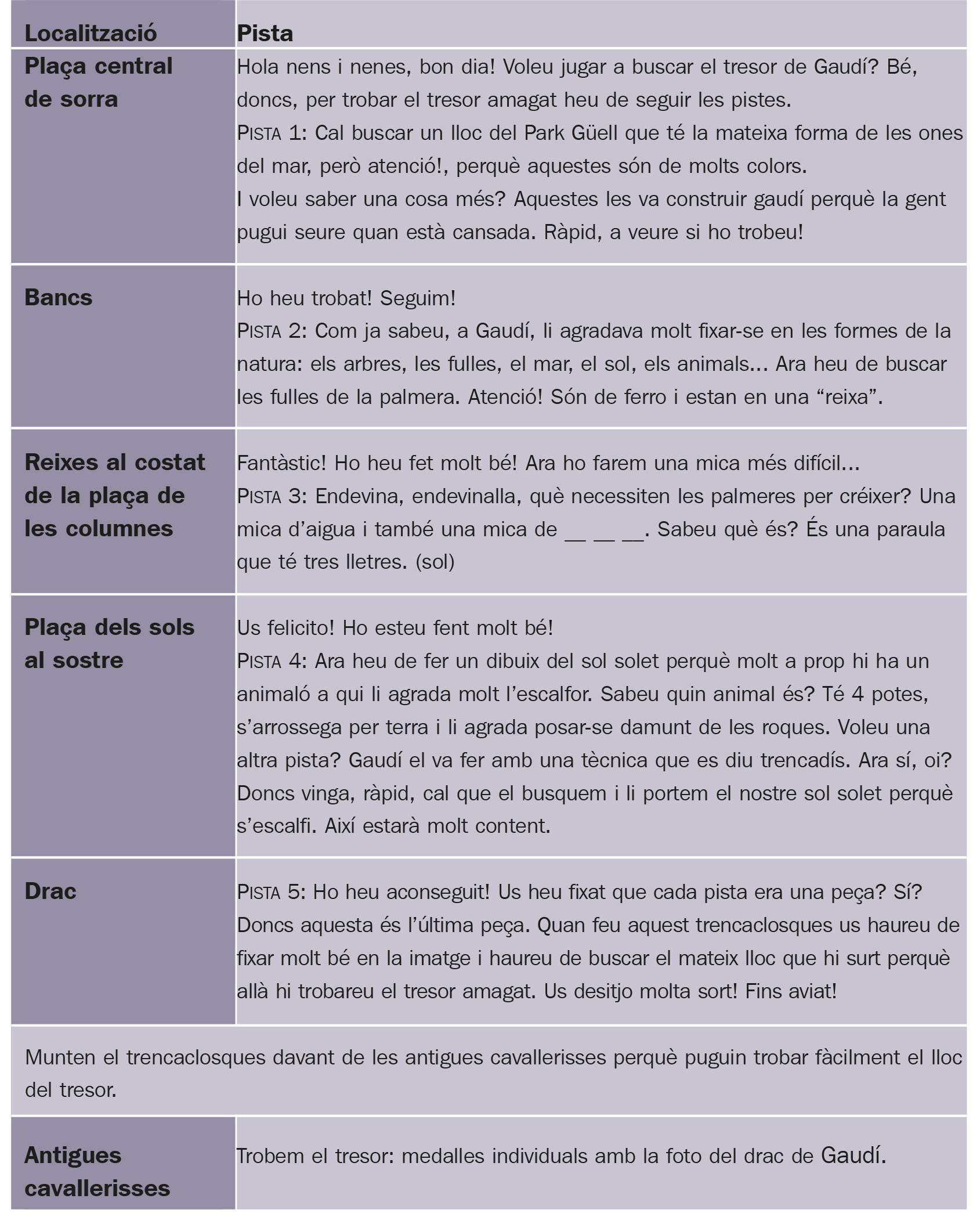 En aquest projecte internivell, amb els tallers de plàstica i una visita dinamitzada per les mestres al Park Güell, els infants dels grups de 3, 4 i 5 anys van descobrir les obres d’Antoni Gaudí. Per què Gaudí? Vam escollir Gaudí perquè ens donava la possibilitat de veure les seves obres in situ i a més, visualment, les seves produccions són molt atractives. Els objectius que ens plantejàvem eren: Conèixer algunes de les obres barcelonines d’Antoni Gaudí. Experimentar amb les dues tècniques més rellevant utilitzades per l’arquitecte: el trencadís i el vitrall. Què vàrem fer? Es va fer un treball amb cada grup i també els tallers internivell i, per acabar-ho d’arrodonir, vam preparar un joc de pistes al Park Güell. Amb el grup, es va fer una introducció a la biografia i les obres de l’arquitecte a través d’un PowerPoint i diferents llibres i imatges. Vam crear «el racó de Gaudí» a cada classe amb diferents llibres i imatges de les seves obres. Hi va haver moltes converses sobre la seva vida, ja que els va impactar molt la seva mort. El nom de les seves obres va servir per fer un treball de lectoescriptura. A grafismes vàrem incidir en els vitralls i els bancs del Park Güell per tal d’observar-los i reproduir-los individualment. Quant als tallers de plàstica, a la nostra escola són internivell, amb els grups de 3, 4 i 5 anys, amb l’objectiu de promoure el contacte entre els infants de diferents edats per així copiar models i ampliar les relacions socials. Es plantegen com un espai en què es transmeten tècniques i habilitats per crear una producció artística, posant èmfasi en el procés i no en la producció final. Els tallers de Gaudí es van centrar en les tècniques del vitrall, el trencadís i el dibuix. Per al taller de dibuix i vitrall, primer es van observar diferents edificis fets per Gaudí i, fixant-nos molt bé en els detalls, vam parlar sobre el fet que Gaudí era arquitecte i no construïa, sinó que dibuixava les seves obres. Després varen dibuixar el propi edifici amb ceres i, si volien fer vitrall, els oferíem paper de cel·lofana per fer-ho. Al taller de trencadís, es van fer tres subgrups on hi havia un o dos infants de cada nivell i entre tots van treballar en equip per construir amb argila el drac del Park Güell o la Sagrada Família. I després van decorar-ho amb rajoletes imitant el trencadís. Al passadís de l’escola es va fer una exposició de tots els treballs fets perquè les famílies i tots els infants i mestres els poguessin veure. La sortida al Park Güell es va plantejar com a cloenda dels tallers; a més, els nens i les nenes es mostraven molt motivats, ja que coneixien moltes obres de Gaudí i tenien moltes ganes de veure-les al natural. Per fer la sortida més dinàmica i engrescadora vam elaborar un joc de pistes on els infants havien de trobar «el tresor de Gaudí». Cada pista era un peça d’un trencaclosques d’una imatge de les antigues cavallerisses on trobarien el tresor (medalles amb una imatge del drac). Com es va avaluar? Els objectius plantejats eren fàcilment avaluables a través de l’observació directa durant els tallers i el treball a l’escola. Es va fer un registre del coneixement de les obres treballades a través de la visita final a l’exposició, on, a més de les produccions dels infants, hi havia imatges dels edificis treballats. Valoració i conclusions L’experiència ha estat molt enriquidora, ja que tot l’alumnat s’ha mostrat molt interessat i motivat, fins al punt que n’han parlat molt amb les famílies i els han demanat de visitar altres obres de Gaudí –la Sagrada Família, la Casa Batlló…–. L’equip de mestres valorem molt positivament el projecte, que és un centre d’interès atractiu amb què es pot treballar de manera globalitzada –l’entorn, els grafismes, la lectoescriptura…– i a més es pot oferir una excursió amb un molt bon plantejament de la jornada. Com a conclusió, és una experiència molt gratificant, ja que al parvulari es respirava un ambient d’interès i motivació envers tot allò relacionat amb Antoni Gaudí, cosa que ha fet que els infants hagin après passant-s’ho bé (gaudint Gaudí).