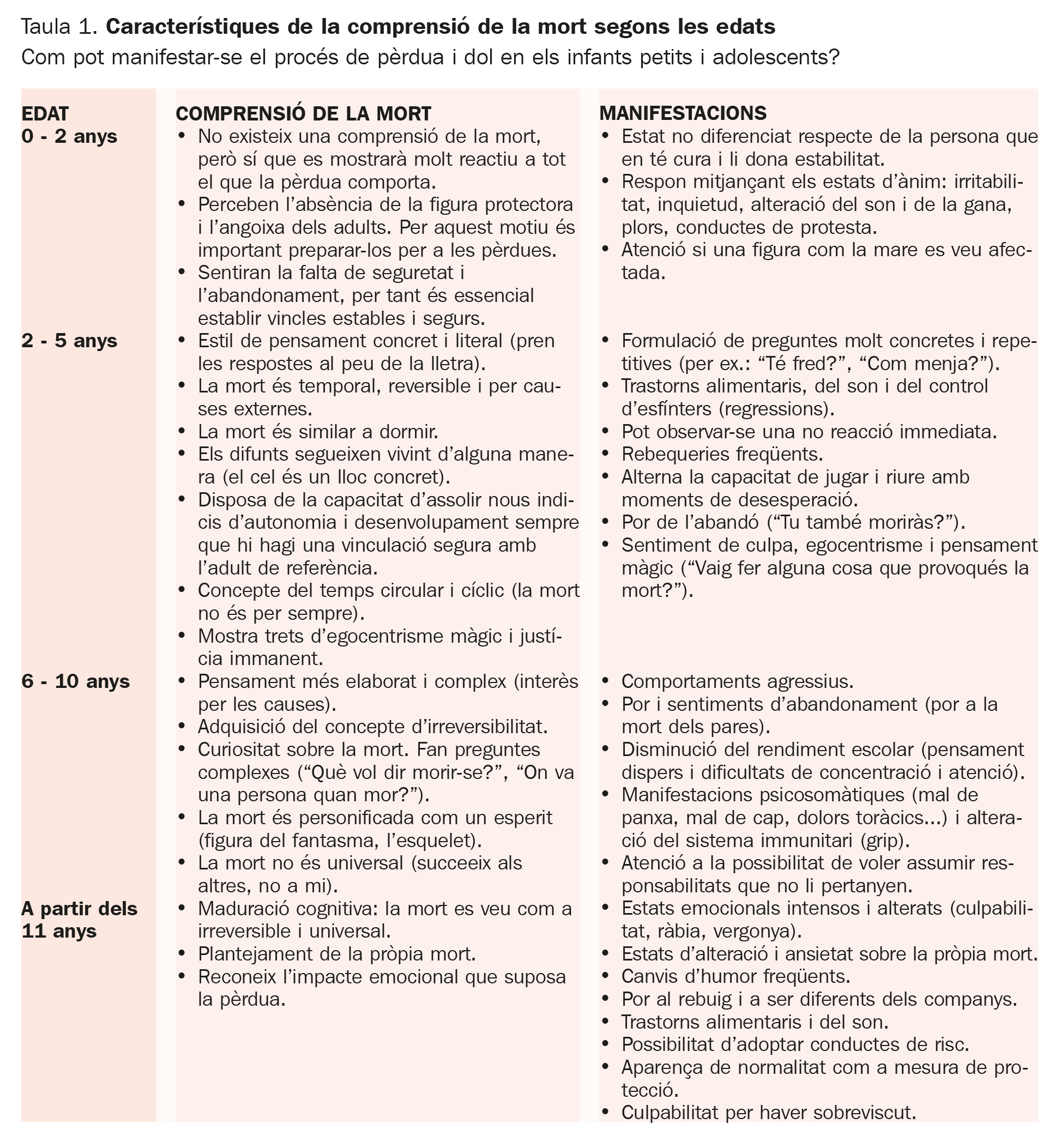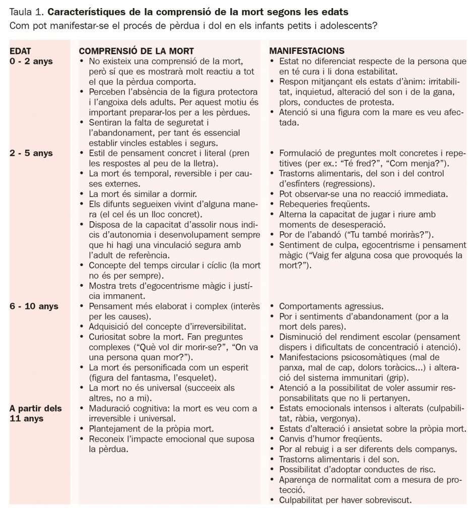 • implicar la comunitat a donar visibilitat a situacions que a dia d’avui encara es viuen des del silenci i la solitud.Com deia Carles Capdevila,4 «la mort reclama silenci i no soroll. La mort atura també la vida dels que continuem vius, l’esquerda i la posa a prova. Respectem el temps de dolor silenciós: ara no és el moment d’abocar-nos a improvisar conclusions des de la ràbia. Ja parlarem, a poc a poc, quan tot sigui menys fosc i tinguem alguna cosa a dir». Els petits i joves de la família, i també nosaltres, els adults que en tenim cura, cal que donem i ens donem permís per sentir, expressar i atendre les seves i les nostres necessitats davant experiències emocionalment tan intenses. Saber tenir cura de la individualitat i el ritme de cadascú, des del respecte i la presència. Belén Calafell, psicòloga especialitzada en processos de dol en infants i joves. Centre d’Atenció en Processos de Pèrdua i Dol (info@atencioperduaidol.com). Notes 1.Payàs Puigarnau, A.: Las tareas del duelo: Psicoterapia de duelo desde un modelo integrativo relacional, Barcelona: Paidós Ibérica, 2015. 2. Arnaiz, V.: «Deu propostes per a una pedagogia de la mort», Guix d’Infantil, núm. 12, març de 2003. 3. www.cime.es/Contingut.aspx?idpub=92176 4. www.ara.cat/opinio/dol-reclama-silenci-no-soroll_129_1580157.htmlBibliografiaPayàs, A. Las tareas del duelo: Psicoterapia de duelo desde un modelo Integrativo- Relacional. Barcelona: Paidós Ibérica, 2015. - El mensaje de las lágrimas. Una guía para superar la muerte de un ser querido. Barcelona: Paidós, 2014.