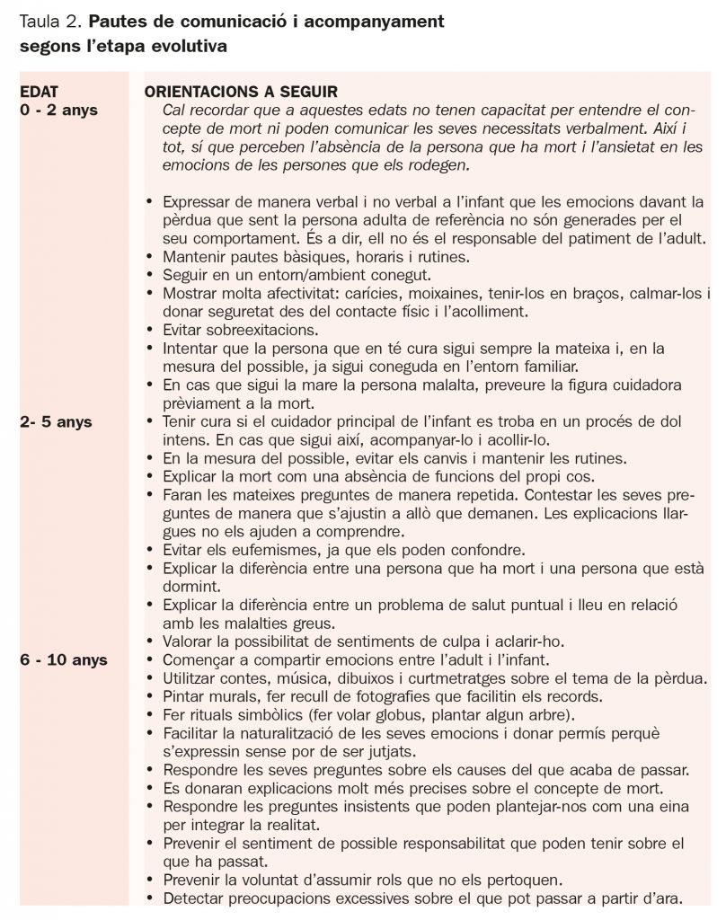 La pèrdua d’un ésser estimat molts cops es converteix en una de les vivències més colpidores que haurem d’afrontar al llarg de la nostra vida. Saber atendre i acompanyar la persona en dol des del respecte i el reconeixement a les reaccions i necessitats pròpies és imprescindible si el nostre objectiu és que aquesta experiència sigui viscuda de la manera més adaptativa i integradora possible. Des del model d’aten-ció i intervenció integratiu-relacional,1 diversos autors fan èmfasi que el dol s’entén com el procés natural de resposta davant la pèrdua d’una persona estimada i que, alhora, aquesta experiència inclourà canvis significatius en les actituds, els comportaments, els pensaments, les emocions i en la vida espiritual de la persona en dol (Freud, 1917; Lindemann, 1944; Murray Parkes, 1972; Bowlby, 1980; Morden, 1991; Rando, 1993; Neymeyer, 1998; Payàs, 2006). Així i tot, i més enllà del marc teòric en el qual els experts emmarquen el dol –entès com aquest conjunt de reaccions esperables envers una pèrdua significativa–, a la nostra cultura parlar de la mort és una realitat complexa, fins al punt de convertir-se en un tema tabú. En aquest sentit, si la societat en què vivim té tendència a protegir-se i amagar la mort de forma generalitzada, aquest fet es fa més palès quan fem referència als infants i adolescents. És més, som els mateixos adults, en el nostre intent per negar la mort i el patiment que ens provoca, que acabem ocultant aquesta realitat tan propera als més petits i joves de la casa i, en conseqüència, no deixem que participin de la manera desitjada dels processos de pèrdua. Dins el nostre àmbit, és molt probable que, des del centre educatiu, alguna vegada haguem de viure una situació de pèrdua i dol, bé sigui per la mort d’un alumne, d’un familiar de l’entorn més proper del nostre alumnat o d’un membre de l’equip docent o la comunitat educativa. Per tant, i com a professionals de l’educació, no podem fer ulls clucs i defugir l’assumpte que segurament ens incomoda. A Menorca fa pocs mesos s’ha materialitzat un projecte que té a veure amb el tema que ens ocupa. Així i tot, i en el transcurs dels anys, alguns professionals de l’àmbit de les cures pal·liatives i de l’educació ja s’han implicat per posar en funcionament algunes iniciatives que donen resposta a la demanda d’atenció concreta als infants i adolescents en dol. En són exemples els treballs de recerca i divulgació elaborats per Vicenç Arnaiz,2 el taller «Els infants i la mort: com podem ajudar els infants a afrontar les pèrdues» –Programa Salut Jove del Consell Insular de Menorca –, el «Grup de dol per a infants d’educació primària» –Ajuntament de Maó i Consell Insular de Menorca–, així com els cursos de formació per al professorat impulsats pel Centre de Professorat de Menorca. Si bé es considera important donar continuïtat en aquesta mena d’iniciatives, també és cert que s’ha vist la necessitat d’establir una estructura de coordinació conjunta, un sistema d’atenció conegut per tots els professionals directament o indirectament implicats i, en darrer terme, l’adaptació d’un document oficial que serveixi de guia en cas de donar-se la situació de pèrdua i dol en els més petits i joves de la comunitat. És així que neix la Guia pràctica per a l’atenció dels processos de pèrdua i dol des dels centres educatius,3 juntament amb la incorporació d’un professional consultor com a responsable de la coordinació, suport i tasques d’intervenció específiques. El procés de dol en els infants i adolescents és similar al dels adults, però el canalitzen d’altres maneres, atès que la seva capacitat de comprensió i expressió també és diferent. En el transcurs de les diferents etapes evolutives i d’acord amb la seva maduresa individual i familiar, cada infant i adolescent manifestarà unes reaccions i necessitats determinades que caldran ser reconegudes, validades i ateses per les figures protectores de referència.                                     Com podem els adults acompanyar aquest procés de pèrdua i dol? Els adults que vetllen pel benestar emocional de l’infant i adolescent en totes les àrees del seu desenvolupament –àrea sociofamiliar, educativa, de la salut, del lleure…– cal que disposem d’uns recursos bàsics i específics a fi de: