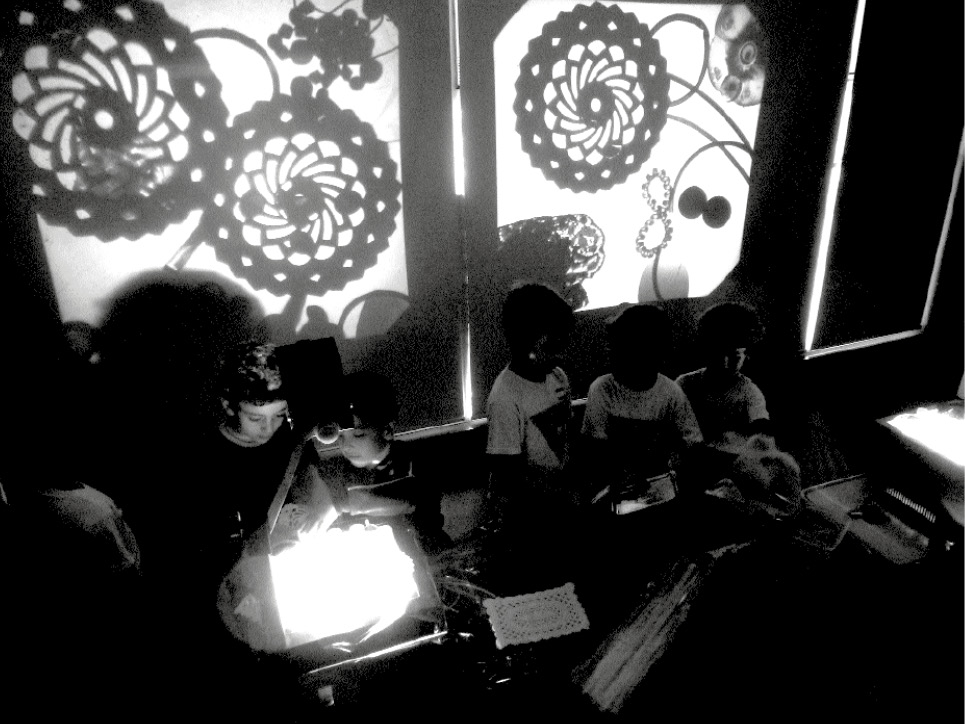 Entre las diferentes motivaciones que llevan a los niños y a las niñas a construir palabras se encuentra, según Bonnet, la motivación metafórica. Para poder conocer el uso que realizan los niños de la metáfora en su cotidianeidad, ya sea mediante un lenguaje figurado o una narración, y cómo esta forma de expresión metafórica es parte de nuestras formas de comunicación y socialización con otros, armamos un escenario que posibilitara a niños y niñas de cinco y seis años experimentar con un retroproyector, con luces y sombras, ya que, en palabras de Vea Vecchi, «luces y sombras, transparencias y colores invitan a explorar e inventar historias en un espacio ambiguo entre la magia y la ciencia. Luz oscura y luminosa, azul, de diamante y de cuento, abandonada». De esta manera, les ofrecemos un contexto enriquecido, con materiales novedosos para ellos –una sutil combinación de texturas, transparencias, colores, imágenes, volúmenes, perspectivas– que propiciaran una experiencia multisensorial, en absoluta libertad de acción para descubrir y explorar, y que de esa forma emergiera la metáfora infantil, porque, como sostiene Malaguzzi, «el niño es un portador de teorías, competencias, preguntas y es un activo protagonista de sus propios procesos de crecimiento y desarrollo».
