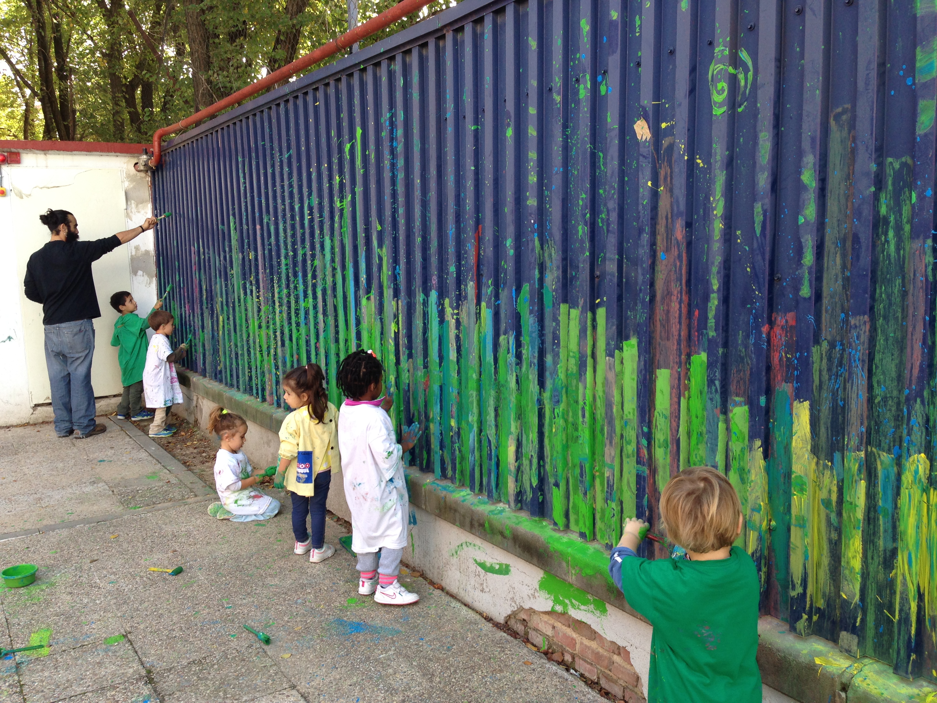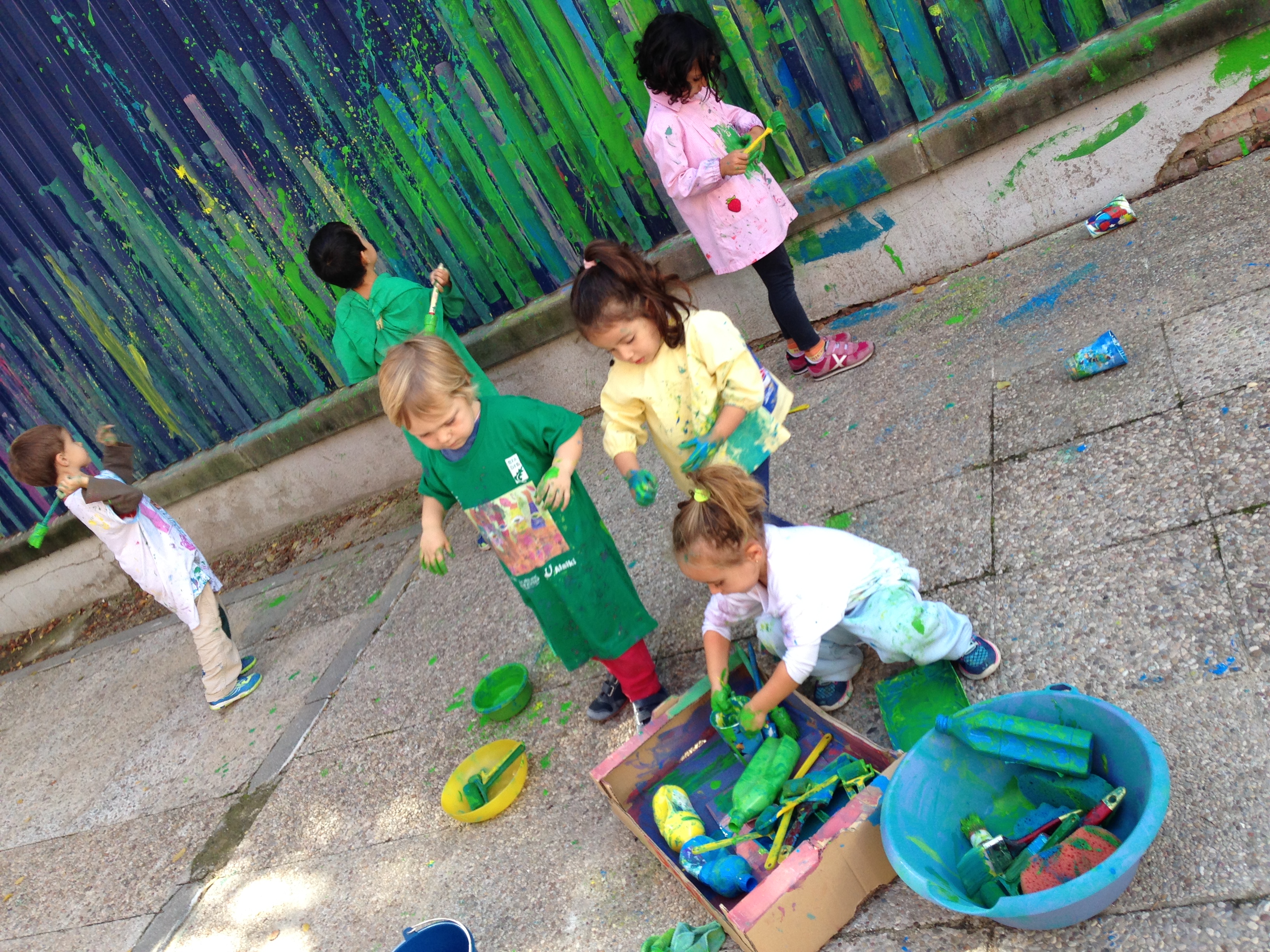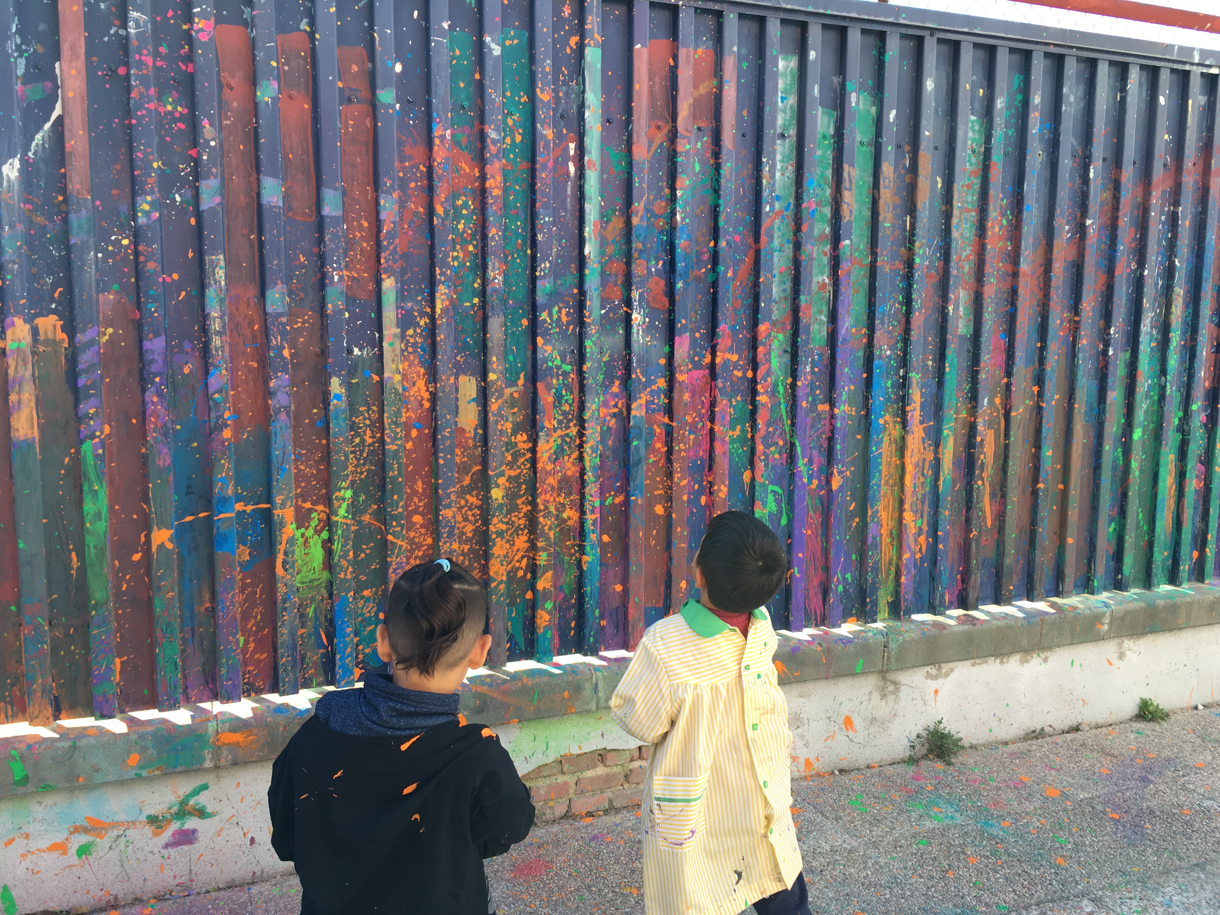 Es un camino delimitado por un enorme muro de valla de color azul, que hemos transformado en un gran panel de arte al aire libre. Decidimos no establecer un diseño fijo para permitirnos el placer de utilizarlo de forma habitual, cosa que nos permite transformar el camino en un paseo agradable, que invita a la necesidad de cambio una vez que nos hemos acostumbrado a ello, proponiendo nuevas sesiones de pintar, imaginando y planificando la próxima intervención.