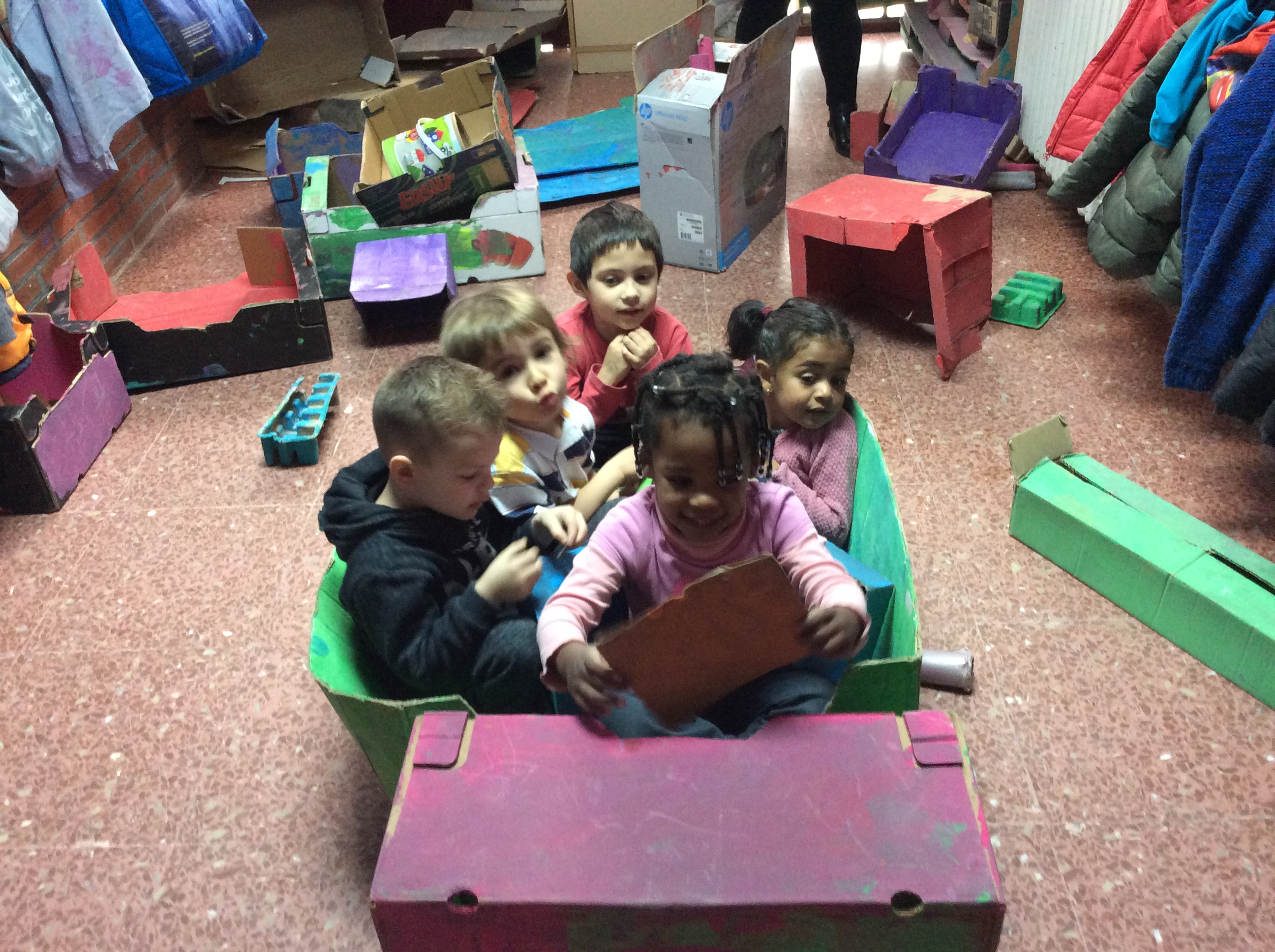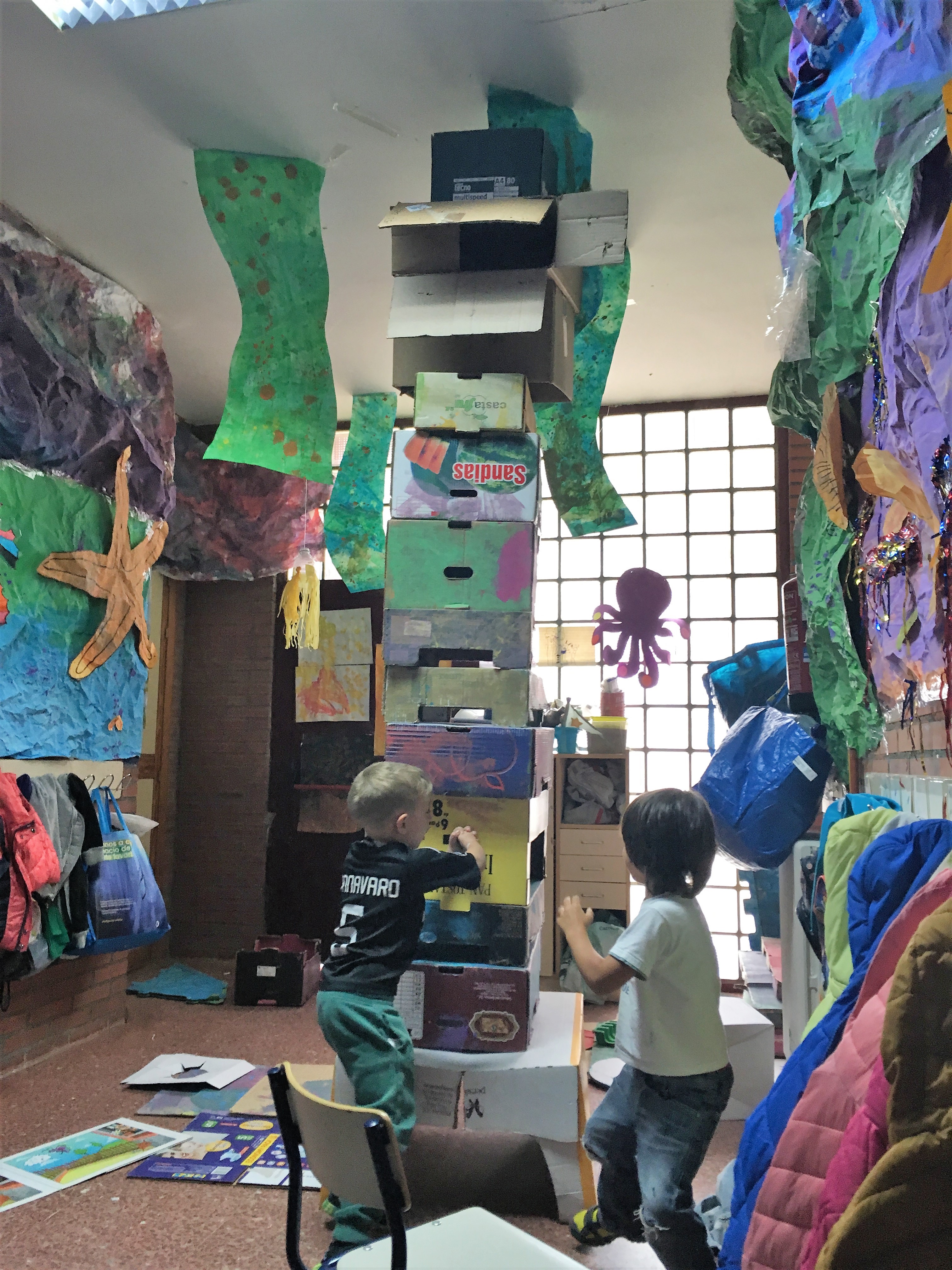Hace algún tiempo, nos dimos cuenta de lo imprescindible que se había vuelto el Rincón de Cartón en nuestra clase, a la vez que irremediablemente gigantesco. Por ello tuvimos que buscarle un lugar más apropiado, en el que, como apuntaron niños y niñas, «tengamos más sitio para construir cosas grandes». Así pues, lo trasladamos al pasillo.