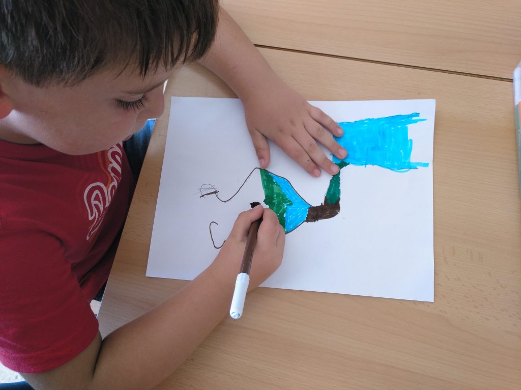 La mayoría de las actividades se fueron generando por descubrimiento. Mi papel mediador me invitaba a llegar a ellos, como cuando pensaron qué podrían hacer para construir el lago y sus reflejos: ¿qué pasa cuando te ves reflejado en el agua?, ¿con qué otros elementos podéis conseguir este efecto?, ¿de qué manera se ven las cosas?