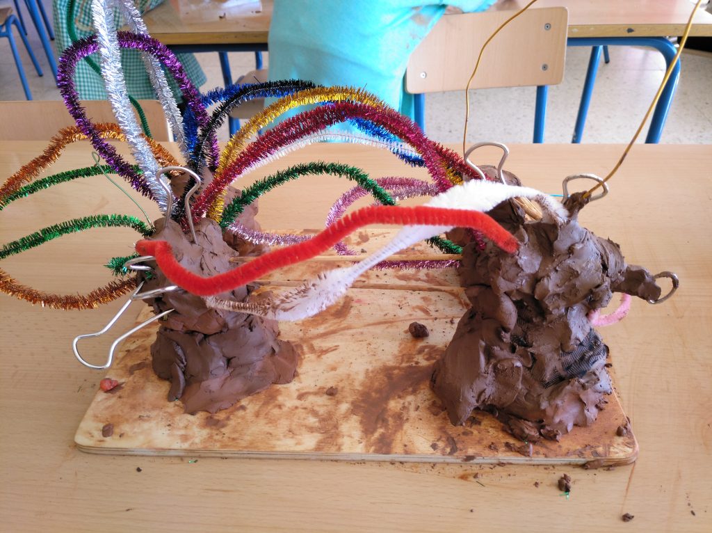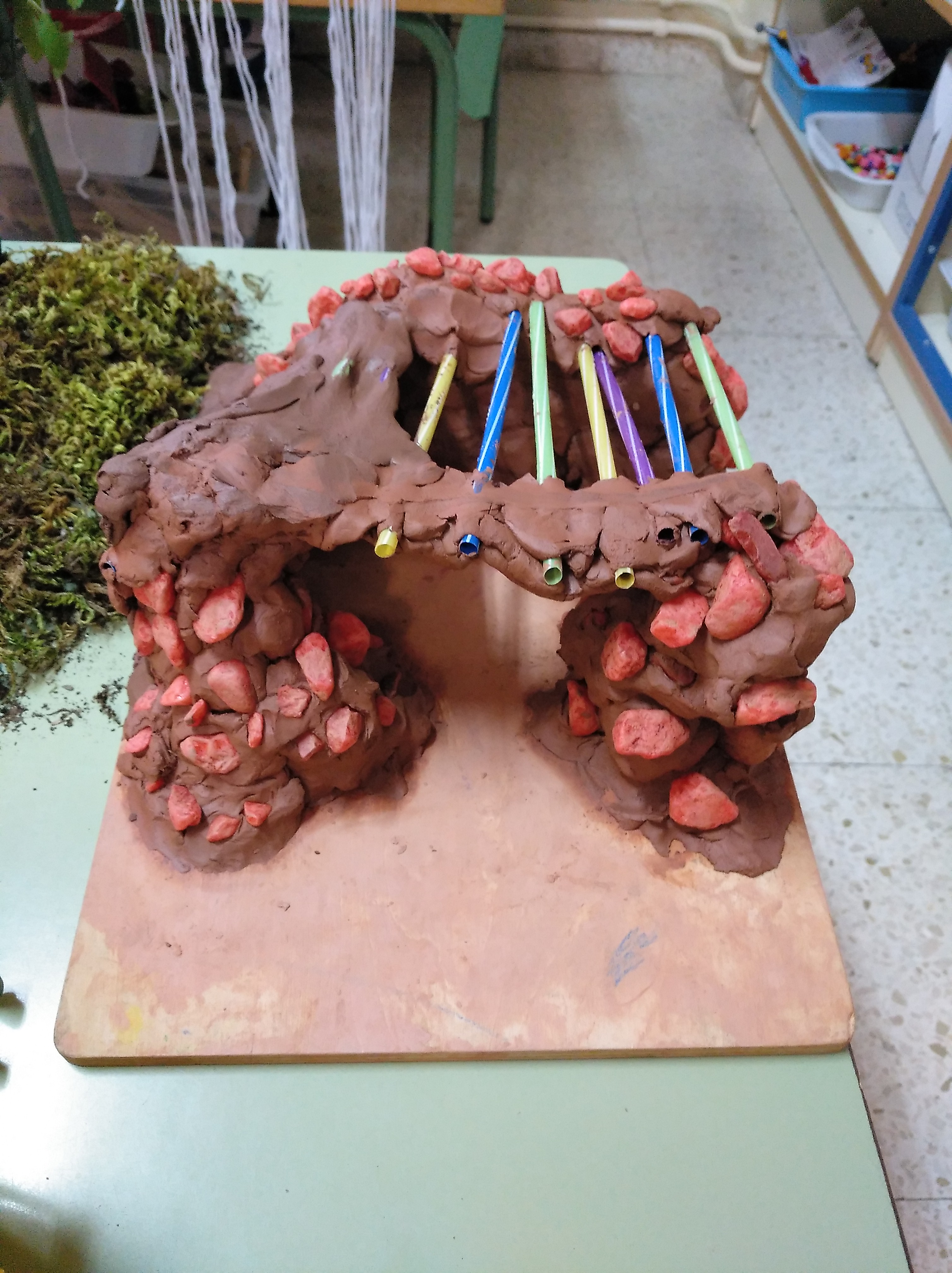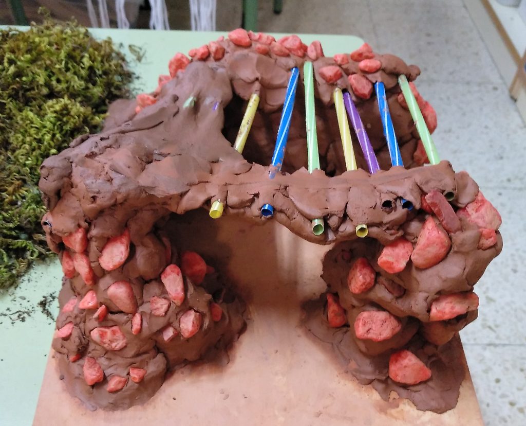 La cueva se realizó con arcilla y palos depresores, lo que generó una gran labor de trabajo en equipo que duró más de una semana. En esta tarea surgieron varios problemas, que fueron resolviendo a lo largo de los días a través de un proceso de ensayo y error: cómo conectar unas dependencias de la cueva con otras sin que se caiga el techo, qué cantidad de arcilla hace falta para darle el grosor necesario a la cueva y que no se derrumben los muros, qué altura tendría… De un día a otro se quedaba un niño o una niña que había estado trabajando el día anterior para proseguir con la tarea y explicar a sus compañeros los posibles problemas con los que se podían encontrar. El fin de semana contamos con la colaboración de una familia que se llevó «la obra» a casa para seguir humedeciéndola y evitar que se endureciera. Durante todo el proceso pude observar y respetar el trabajo de cada uno, ya que, mientras de algunos surgía la simple necesidad de manipular la arcilla y disfrutar con ello, de otros emanaban las ideas que se iban compartiendo y conectando a lo largo de los días. Toda labor, tanto si es más avanzada como si es manipulativa, es imprescindible: