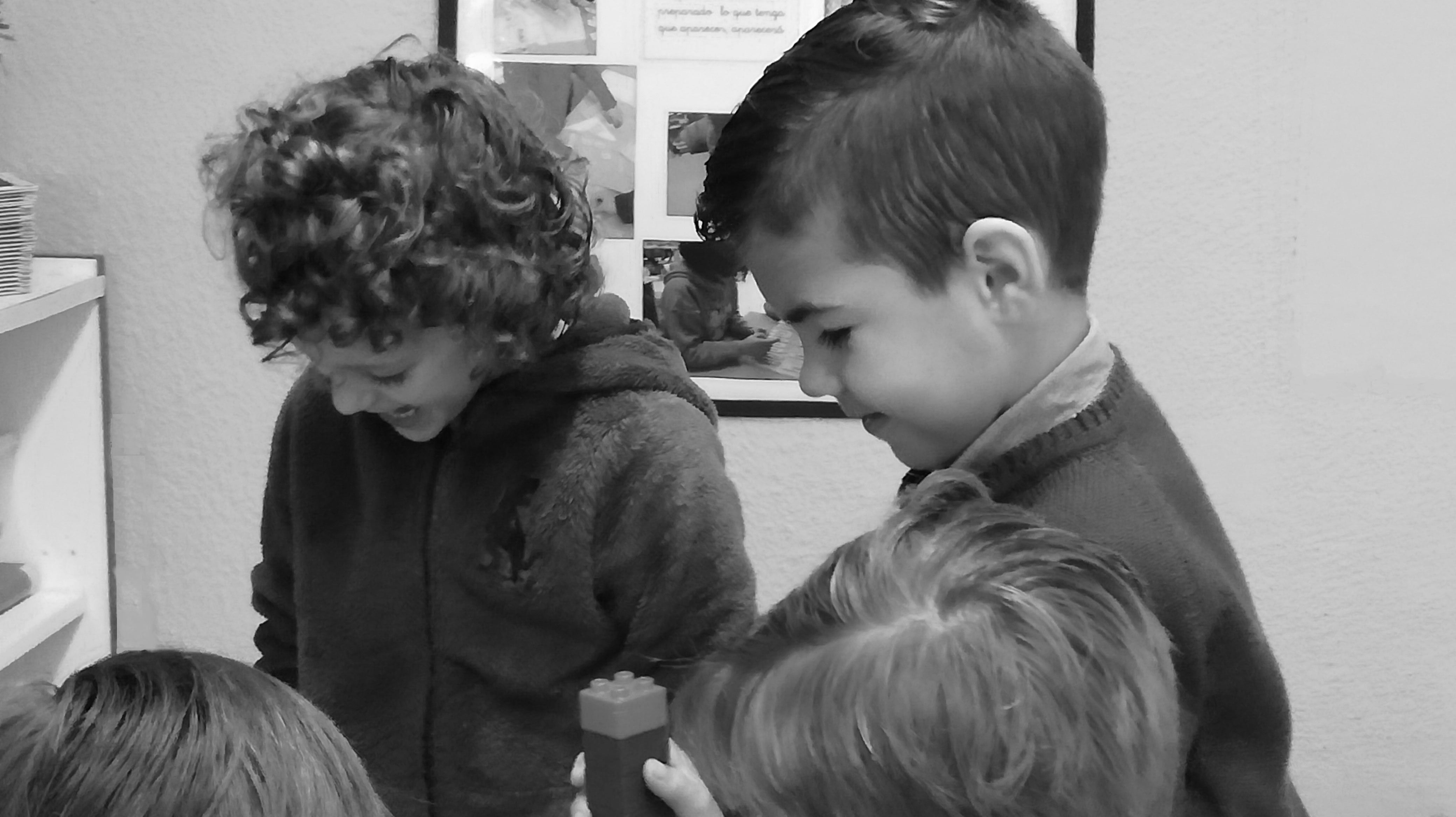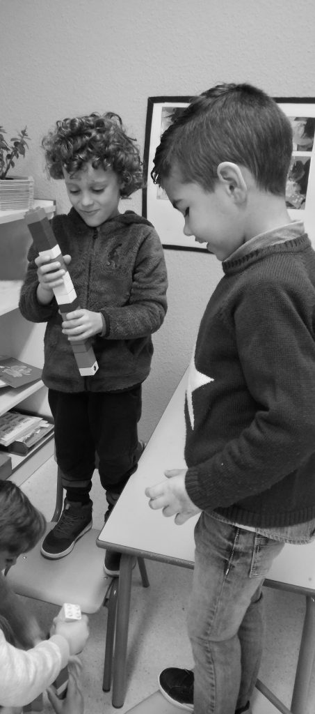 Hugo y Adrián han decidido hacer una torre, después de haber visto a sus compañeros y compañeras realizar una variedad de ellas a lo largo de la semana. Se trataba de construir una torre con los materiales que encontraran por clase, sin mayor consigna que la marcada por el uso de los materiales, fueran grandes, pequeños, medianos, de cartón, etc.