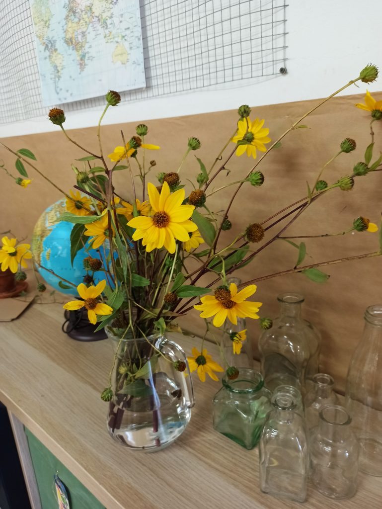 Un pequeño grupo puede encargarse de regar las plantas de toda la escuela. Hay maneras seguras de hacerlo, cuando los otros no están y desinfectando todo lo que pueda ser un objeto de contagio (los niños y niñas aprenden a hacerlo y están muy concienciados). Y se pueden dejar notas en los espacios explicando cómo se han encontrado las plantas, o simplemente un «¿Cómo estáis? Os hemos regado las plantas». Dejar un ramo de flores recogido mientras se hace la jardinería de la escuela en los diferentes espacios es un mensaje simbólico que dice: «Estamos aquí y sabemos que vosotros también».