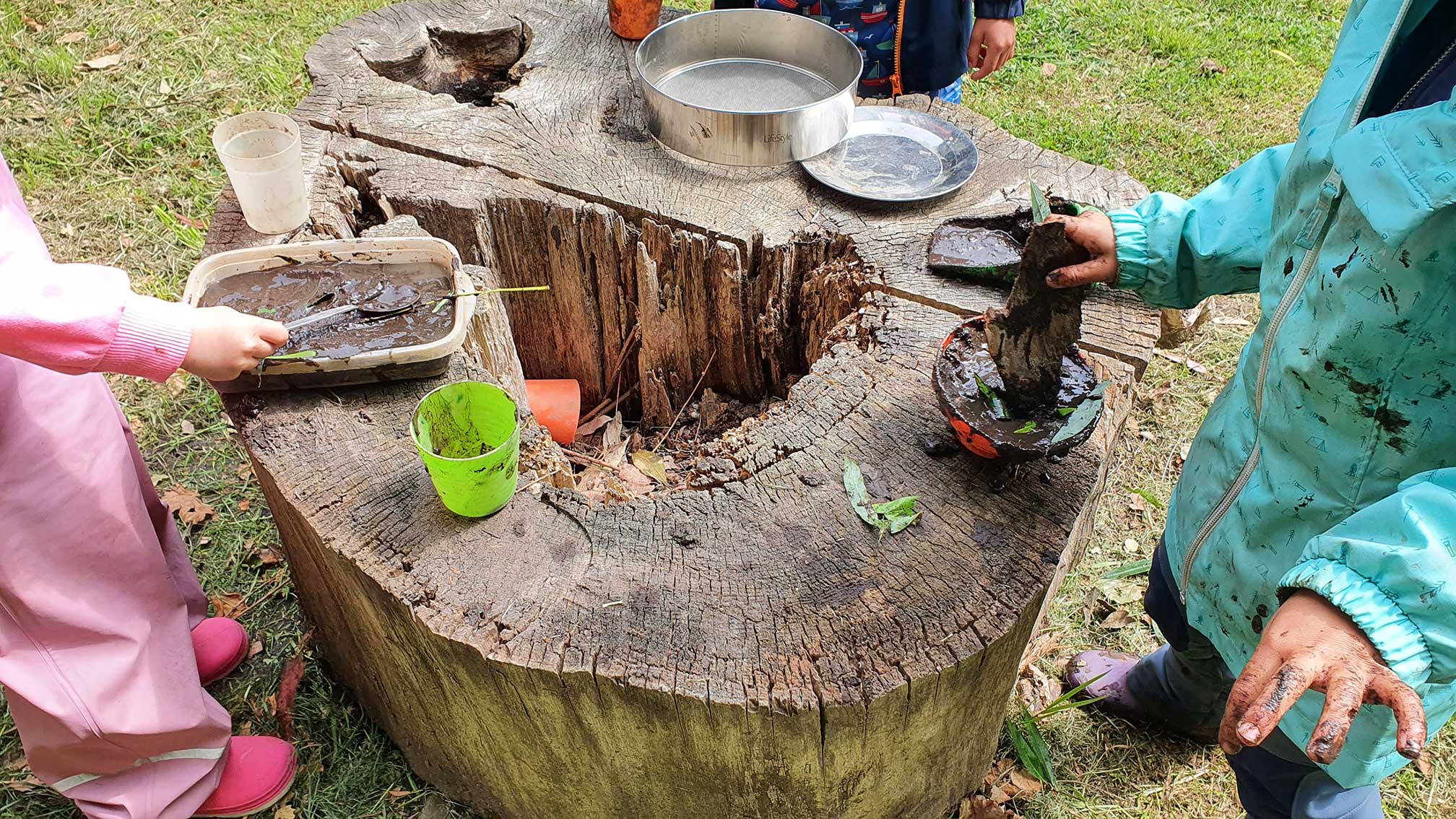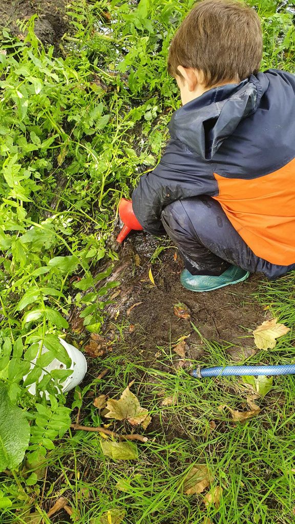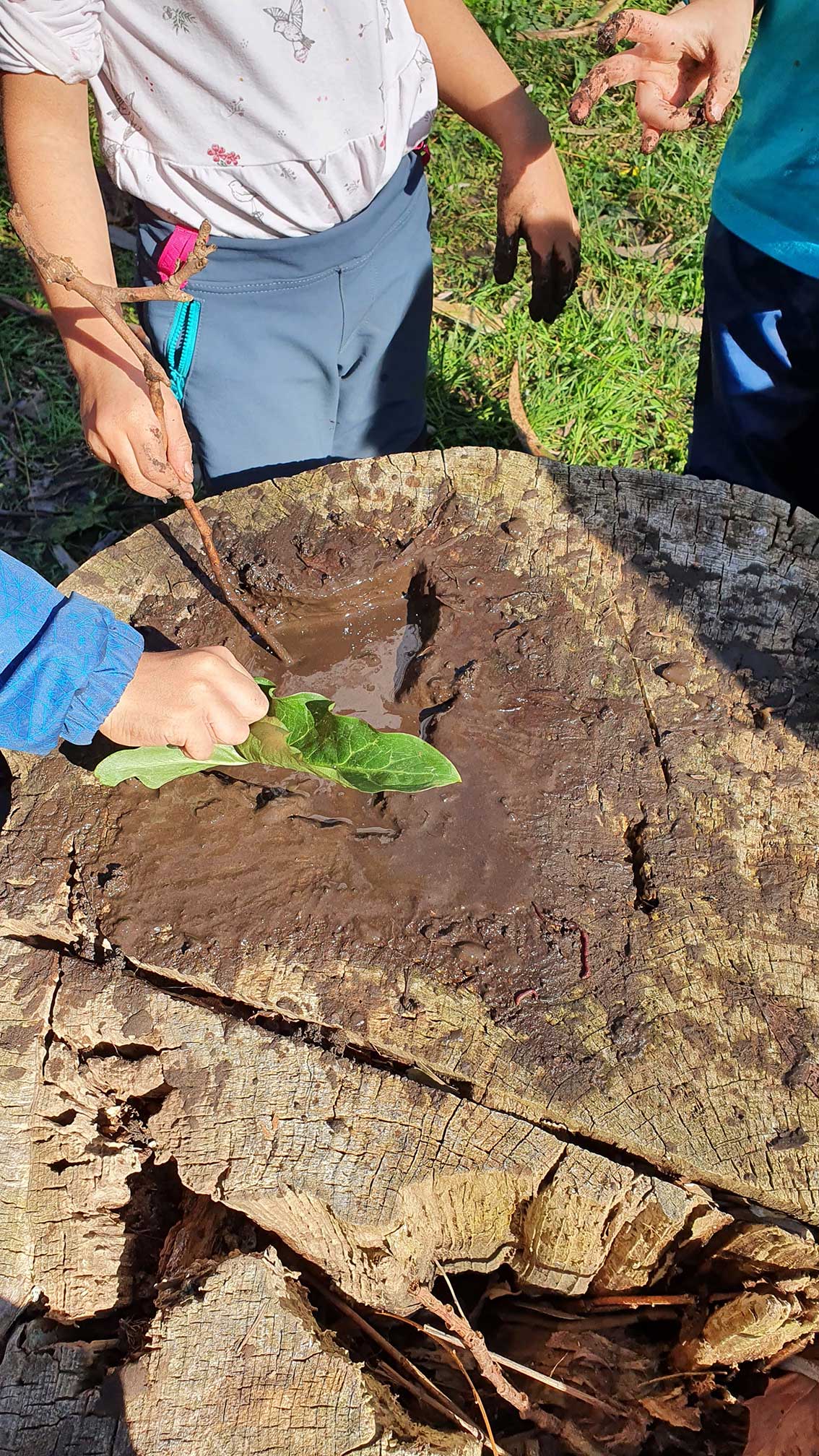 Las educadoras partimos de ese espacio, con los objetos que allí se encuentran: palos, agua, hojas, barro, etc., como únicos elementos y materiales. Así, cada viernes observábamos cómo se daban diferentes tipos de juego: el juego de cocinitas o barcos piratas usando como base el tronco talado o caído de un árbol; la exploración del entorno trepando, rodando o saltando por las cuestas de hierba, ramas de árboles o piedras sugerentes; el descubrimiento de posibilidades de expresión pintando con barro manos y palos; etc. Con el paso de los días, pudimos comprobar que el juego con agua en el regato y el bebedero, que formaban parte de ese entorno, era el más recurrente y aclamado. Unos intentaban pasar al otro lado del regato probando y ensayando su potencia y dominio del salto, otros saltaban dentro como si fueran charcos para salpicar o para ver el agua saltar, otros realizaban trasvases, etc., y otros muchos comenzaron a elaborar un proyecto al que intentaban buscar soluciones: crear una presa en el bebedero y desviar el agua del regato. Buscaban palos para generar canales, hojas de árboles tubulares o barro para crear un muro de contención. Sumergidos en el método científico, iban generando hipótesis, experimentando, verificando o no lo planteado, etc.