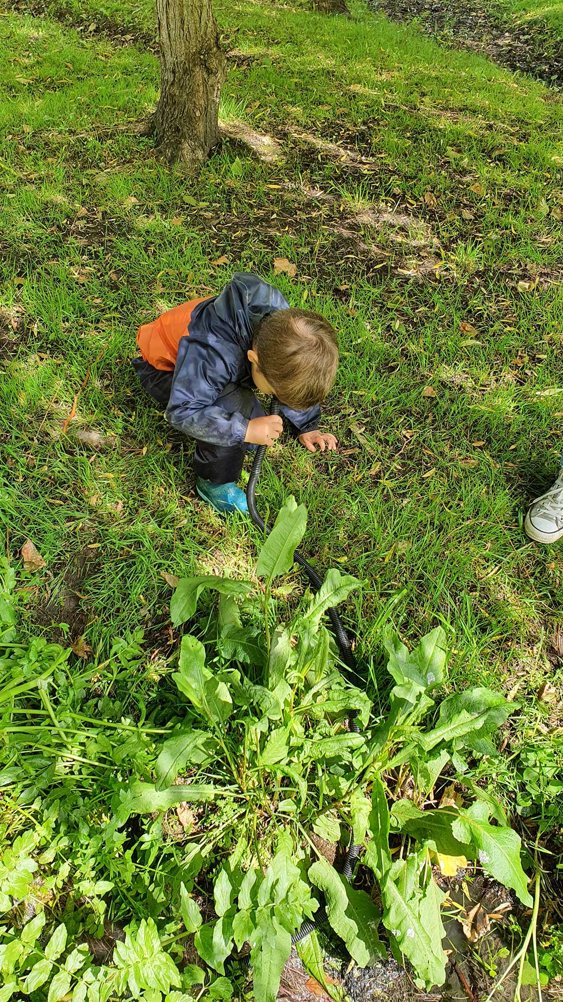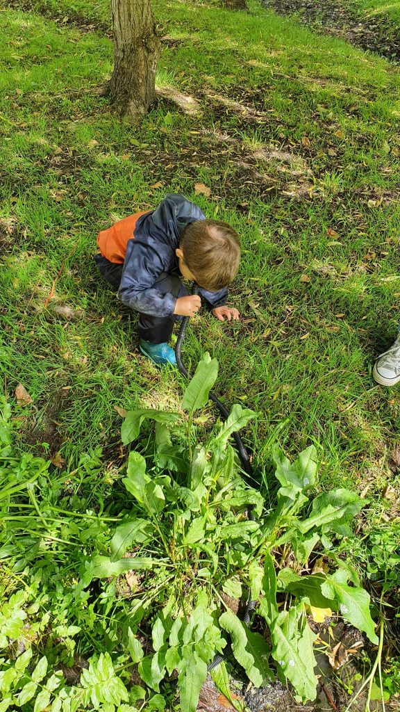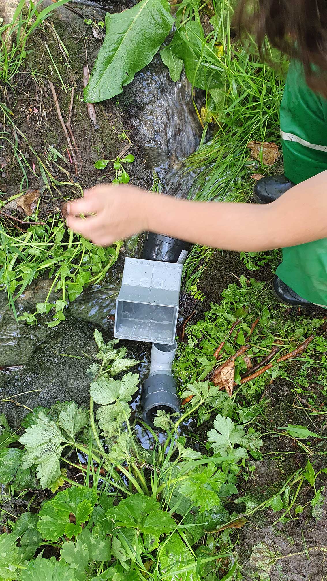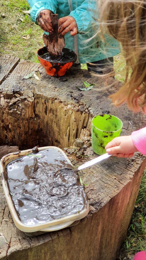Las educadoras partimos de ese espacio, con los objetos que allí se encuentran: palos, agua, hojas, barro, etc., como únicos elementos y materiales. Así, cada viernes observábamos cómo se daban diferentes tipos de juego: el juego de cocinitas o barcos piratas usando como base el tronco talado o caído de un árbol; la exploración del entorno trepando, rodando o saltando por las cuestas de hierba, ramas de árboles o piedras sugerentes; el descubrimiento de posibilidades de expresión pintando con barro manos y palos; etc. Con el paso de los días, pudimos comprobar que el juego con agua en el regato y el bebedero, que formaban parte de ese entorno, era el más recurrente y aclamado. Unos intentaban pasar al otro lado del regato probando y ensayando su potencia y dominio del salto, otros saltaban dentro como si fueran charcos para salpicar o para ver el agua saltar, otros realizaban trasvases, etc., y otros muchos comenzaron a elaborar un proyecto al que intentaban buscar soluciones: crear una presa en el bebedero y desviar el agua del regato. Buscaban palos para generar canales, hojas de árboles tubulares o barro para crear un muro de contención. Sumergidos en el método científico, iban generando hipótesis, experimentando, verificando o no lo planteado, etc.