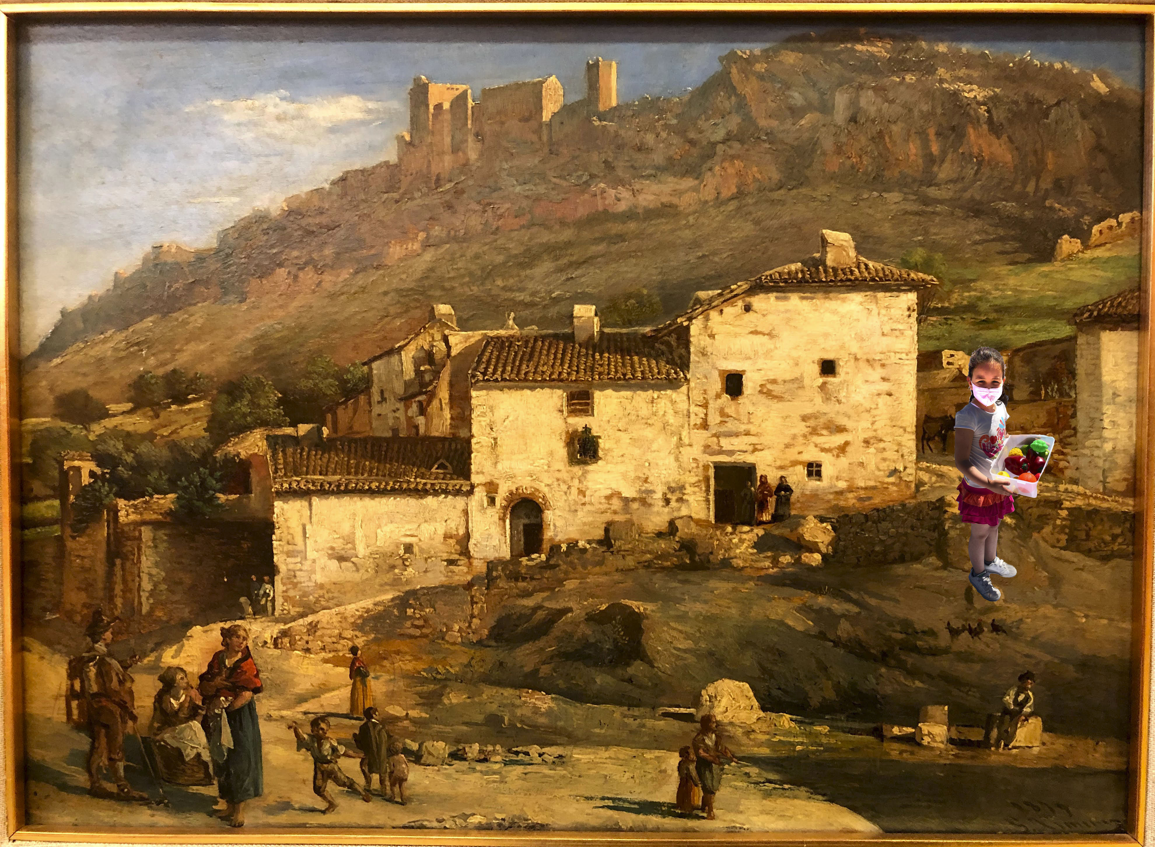 Seleccionar la obra sobre la que ser protagonista no fue fácil, cada una contenía matices diferentes que evocaban acciones muy distintas: «casa rota», el río, el mar, «las piscinas de colores», la montaña, las caras múltiples sin rasgos faciales, «el lagarto de Jaén»... Adentrarse en esos paisajes e imaginarse lo que podrían realizar en ellos elaborando un guion en el que representarían el papel principal de la escena, actuando y dando voz a los personajes que intervienen, llevó a los niños y niñas a pensar cuál sería la postura corporal adecuada a la acción que realizarían en el relato creado. Una vez definido todo, los fotografiamos para incluirlos en el lugar exacto que indicaron cada uno de los niños y niñas. Hubo quien pensó que, para ser más fieles a lo que querían representar, necesitaban sostener objetos como una pala para buscar serpientes en la arena del desierto o una bandeja con frutas para venderlas por las calles del pueblo.