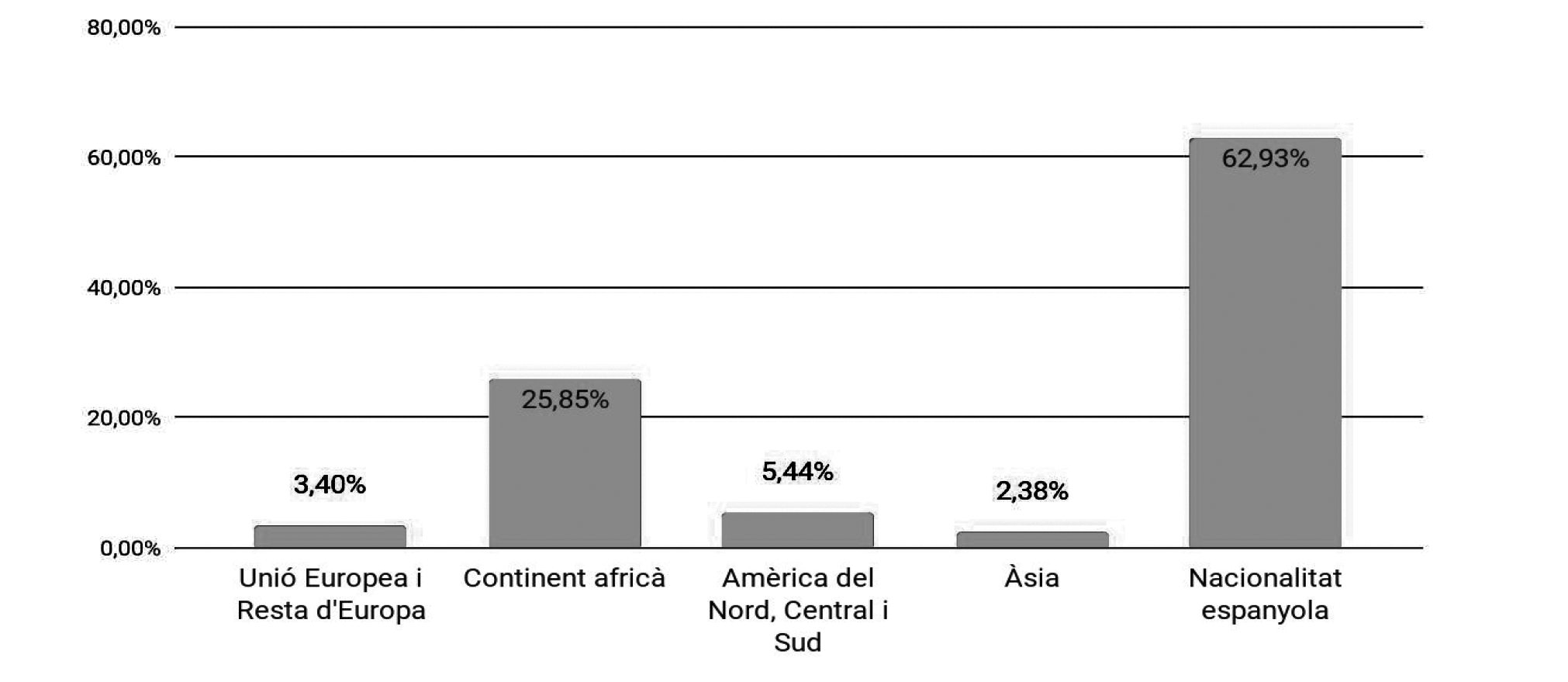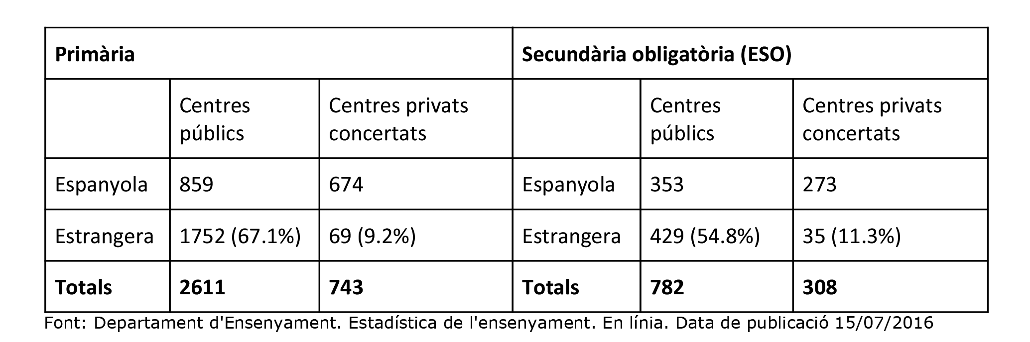 Tenim una distribució desigual de l’alumnat als centres educatius, en funció de la renda familiar (la quota d’aportació de les famílies fixada pels centres concertats és una barrera clara per a determinats alumnes) i del seu origen familiar. Així doncs, i amb dades del curs 2015/16, veiem que a les escoles públiques hi ha un percentatge del 67% d’alumnat estranger, enfront del 9,29% als centres privats concertats. Si observem les dades per a l’educació secundària obligatòria, veiem que als instituts públics hi ha una mitjana del 54,86% de joves estrangers per l’11,35% als centres privats concertats. Curs 2015/2016, alumnes matriculats per nacionalitat
