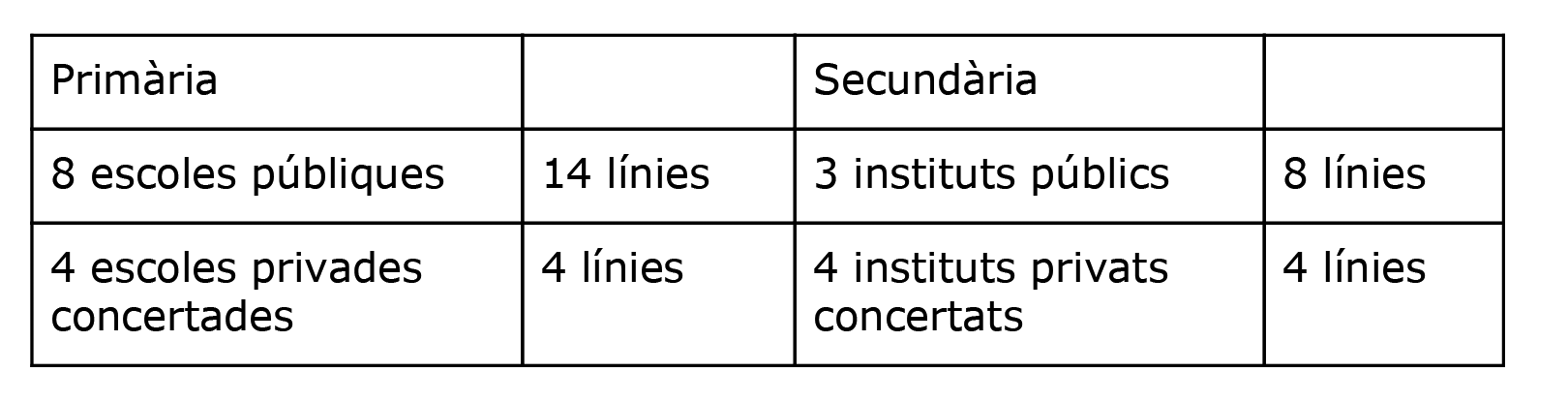 Actualment, com a la resta de municipis la pressió és a la Secundària per l’augment d’alumnat i la baixa oferta de línies disponibles. Això obligarà el Departament d’Ensenyament a obrir dues línies extres per al curs 2018/19. Aquest augment demogràfic, sumat a la forta mobilitat de l’alumnat, amb un nombre elevat d’incorporacions tardanes, fa que en aquest curs 2017/18 totes les línies de Secundària estiguin per sobre de la ràtio de 27 marcada pel Departament d’Ensenyament. En canvi, els centres concertats admeten fins a 32/33 alumnes a les preinscripcions, omplint les aules a principi de curs i evitant així haver d’assumir cap alumne d’incorporació tardana.