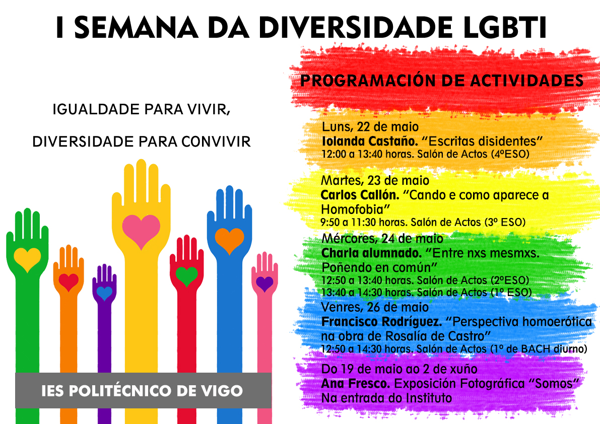 En l’organització d’aquesta setmana va ser inestimable l’ajuda de la meva companya Carmen Adán, que va contactar amb tots els ponents per impartir xerrades sobre diversos temes com la literatura dissident, per Iolanda Castaño, els orígens medievals de l’homofòbia, per Carlos Callón, i sobre la perspectiva homoeròtica en l’obra de Rosalía de Castro, per Francisco Rodríguez.