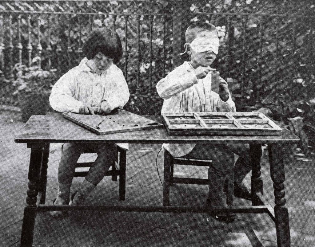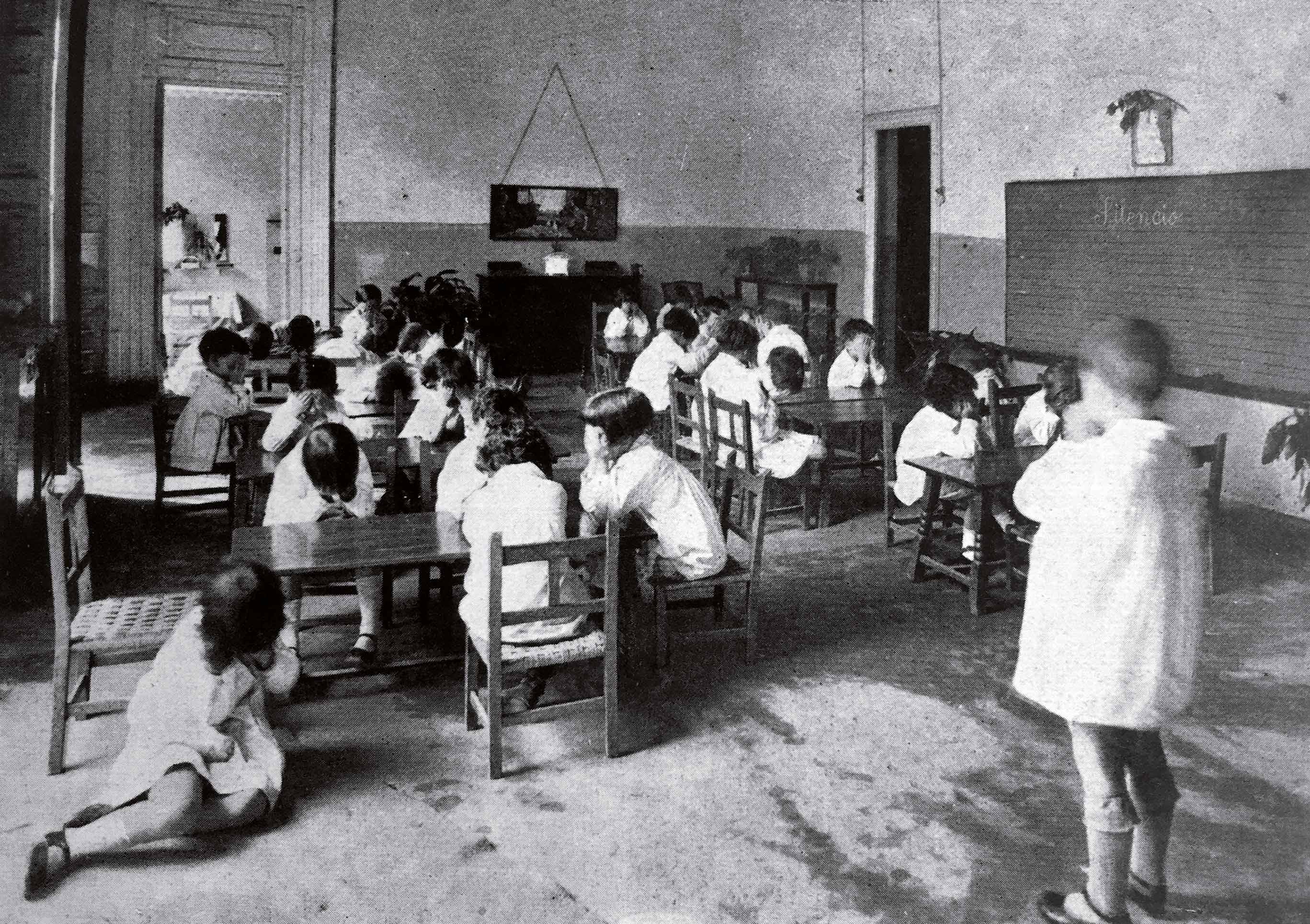 Escola Municipal Montessori de Barcelona (Carrer d'Ataülf, 12). Exercicis a ple aire (reconeixement de formes i vida pràctica) i la lliçó del silenci. Del llibre L'escola pública de Barcelona i el mètode Montessori, de l'any 1933, publicat per l'Ajuntament de Barcelona.[/caption]