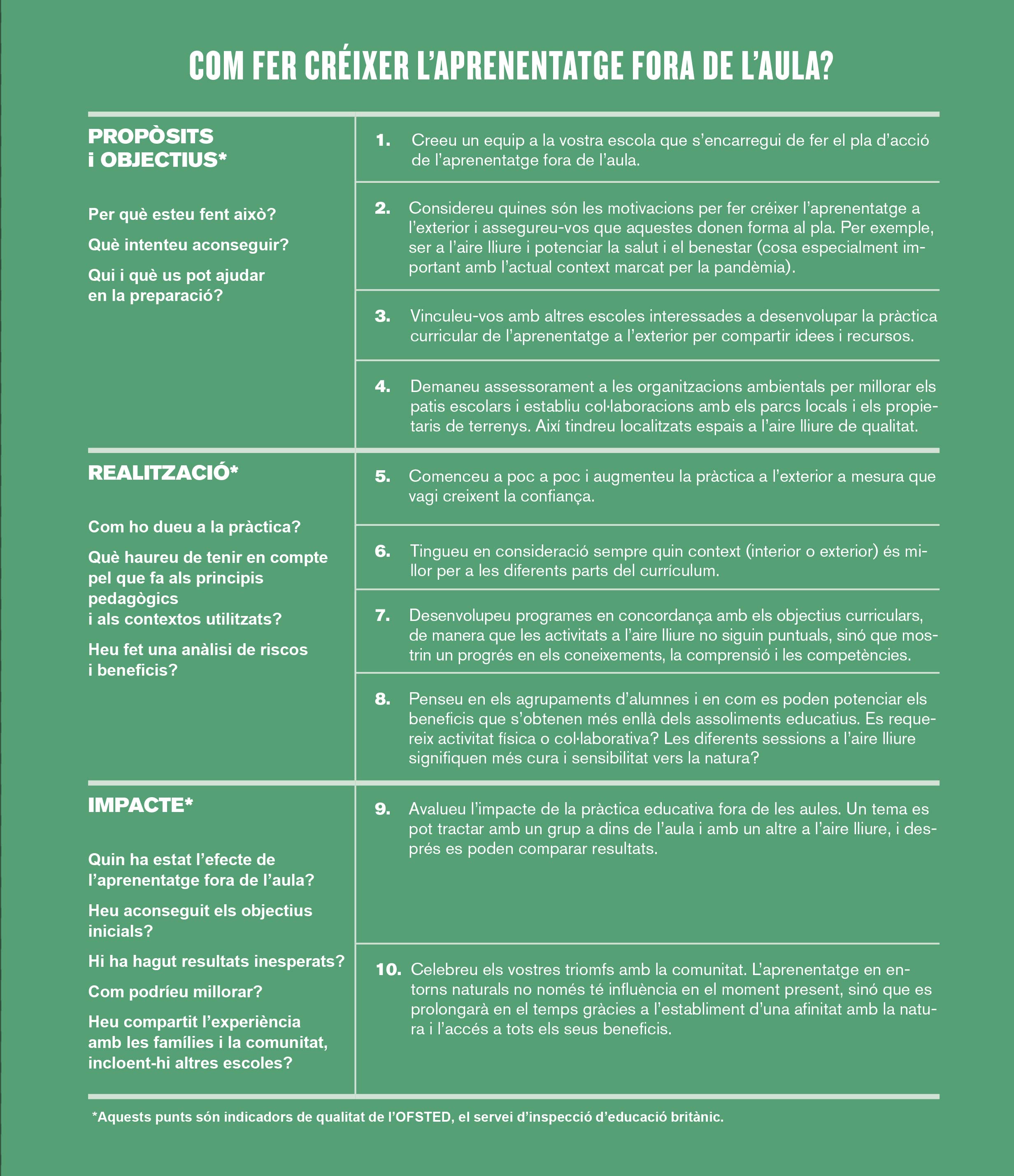 Si esteu interessats a veure l’evidència acadèmica d’aquesta experiència, els articles d’investigació de la Children and Nature Network (‘Xarxa Infants i Natura’) ofereixen molta informació; els podeu consultar a: www.research.childrenandnature.org. Atès que el temps continua sent el gran repte dels mestres ocupats, els esquemes que hi ha sobre el treball curricular en relació amb la progressió de l’aprenentatge fora de l’aula per matèries i per cursos poden ser molt útils. Aquests recursos ofereixen un suport inicial a la pràctica i poden ser un impuls potent per al canvi.