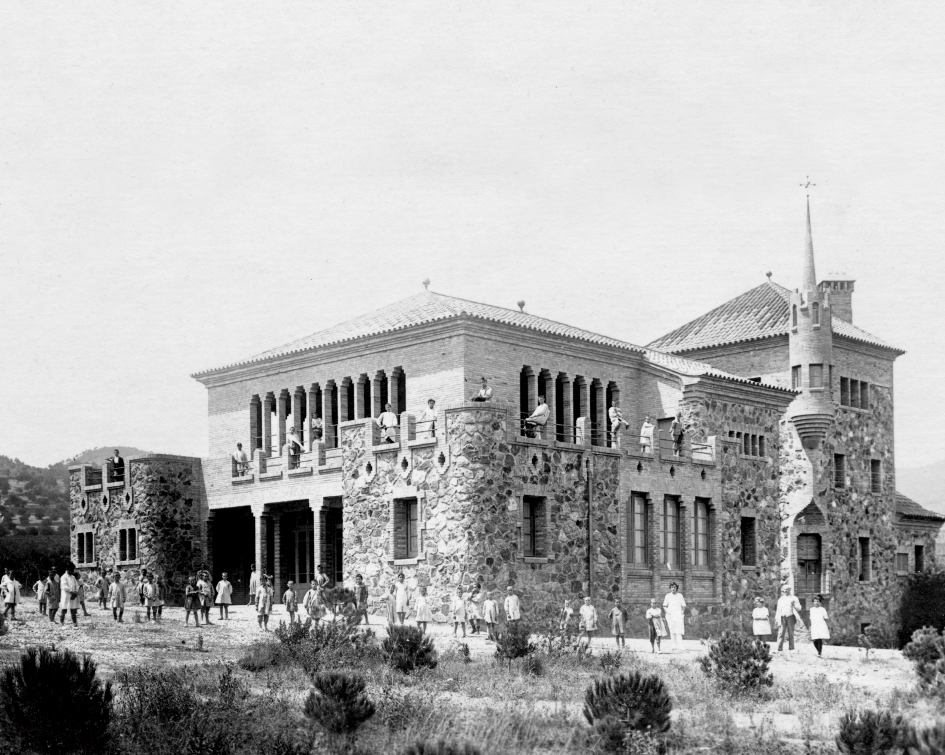Imatge de l’antiga escola de la Colònia Güell, a Santa Coloma de Cervelló, a la comarca del Baix Llobregat. Al fons, la casa amb la garita acabada en punxa és la casa del mestre, el qual podia accedir a l’escola a través d’un pont. És un edifici diferenciat de la resta de la colònia, de planta irregular, recobert amb pedra i amb maó vist. Es va construir quan ja estaven pràcticament finalitzades l...