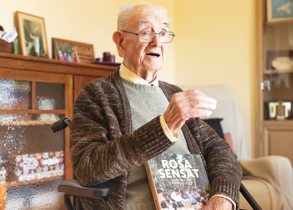 Té 96 anys ben portats, a punt de fer-ne 97. Les cames li flaquegen i, a causa d’un recent trencament de fèmur, ha d’anar amb cadira de rodes. Conserva, però, un cap clar i una memòria justa, i un matí del mes de febrer l’anem a veure amb Mar Hurtado, actual presidenta de l’Associació de Mestres Rosa Sensat; Joan Juanola, que li farà les fotos, i Jaume Cela, mestre i escriptor bon amic seu que m’ha ajudat a l’hora de fer aquesta entrevista. Tots quatre aprofitem per regalar-li el llibre