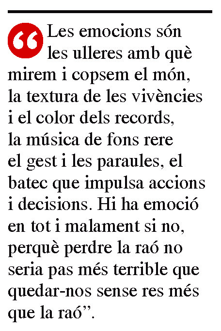 A voltes tresor i a voltes turment. Tan vital i preciosa com ambivalent i imprecisa. Tan necessària i determinant, i no obstant tan carregada de malentesos i tan desconeguda. Se’n parla més que mai però se’n parla poc encara. Batega en tot i en tothom, més fort o més suau, més a la vista o més ocultament. No hi ha vida sense emoció. Ni cap vida que en pugui romandre al marge. Ens acompanya des del...