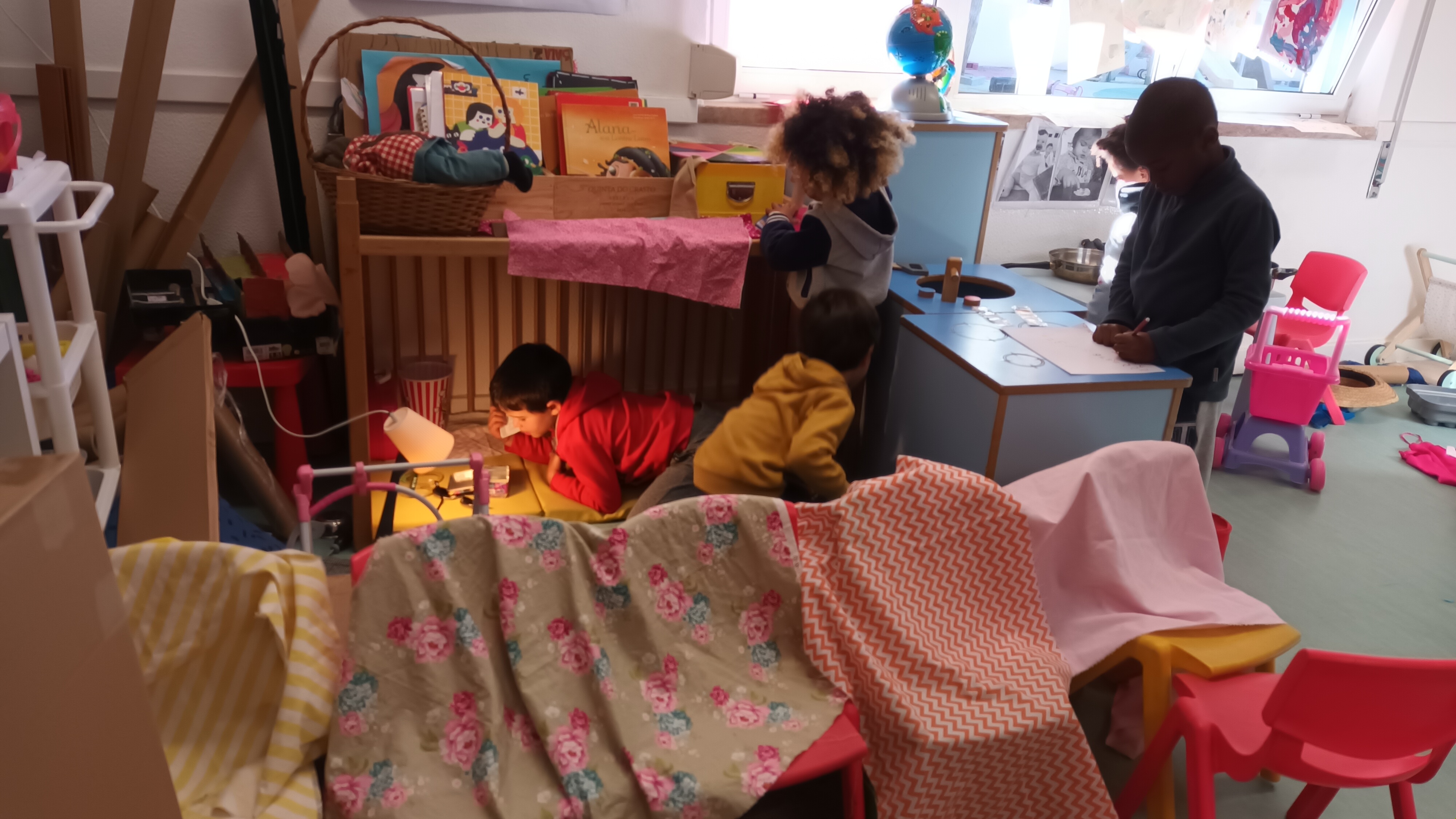 Materials oberts: L’existència de materials oberts a l’estança pretén nodrir la creativitat tan present en els infants. La disposició de les zones adquireix més potencial amb espais joc simbòlic a les quatre cantonades de l’estança. La construcció de tendes i refugis és constant. No es deixa res a l’atzar: els infants s’endinsen en un procés de tria i organització curosa dels materials que els són útils per al seu objectiu. Com a grup, estem compromesos a trobar espai perquè cada persona pugui existir i actuar al centre d’aquest col·lectiu.