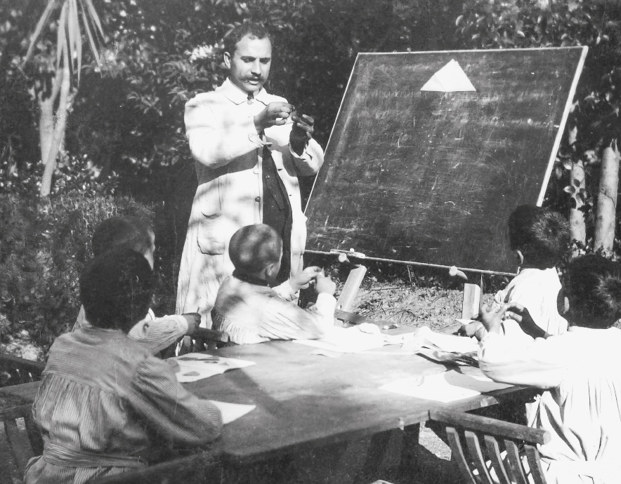 El mestre Antolín Monroy Paz amb els seus alumnes de l’Escola de Bosc de Montjuïc, en una classe a l’aire lliure. Ell era el director de la secció de nois; Rosa Sensat, de la de noies. Salvador Domènech dona a conèixer un document, en el llibre Manuel Ainaud i la tasca pedagògica a l’Ajuntament de Barcelona, en què Monroy explica com era l’Escola de Bosc: «És una escola a l’aire lliure d’educació integral, la qual es diferencia únicament de les escoles corrents per ésser els seus alumnes infants dèbils seleccionats, als quals, amb tot i no tenir malaltia declarada, convé que siguin educats a l’aire lliure i en un clima de muntanya».